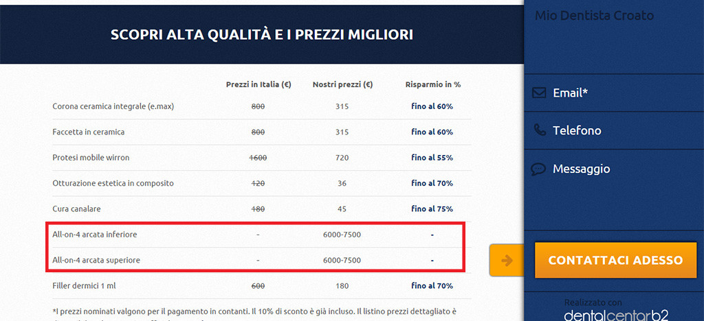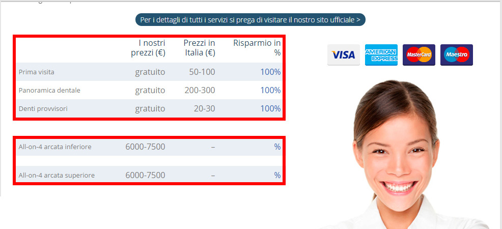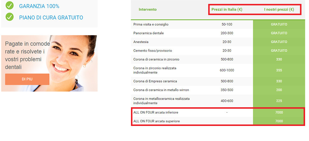 Se in Italia sono veramente pochi i centri odontoiatrici che ricorrono a prezzi civetta, spostandoci all’estero, questa pare essere la prassi. Durante la nostra ricerca ci siamo imbattuti in tante offerte troppo basse per essere vere che alimentano l’illusione che all’estero le cure dentali costino molto meno rispetto all’Italia. Ecco tre esempi (clicca sulle immagini per ingrandire):