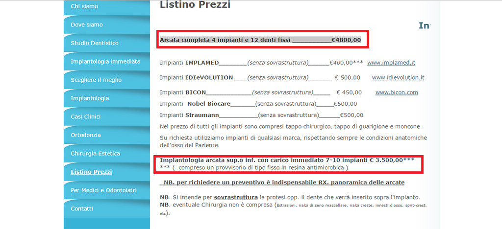 Avevamo scritto un articolo sui prezzi degli impianti dentali in Italia evidenziando gli aspetti che influiscono sul prezzo. Vogliamo sottolineare che i prezzi di riferimento da noi riportati in quell’articolo sono da considerarsi finiti e reali e si riferiscono al ripristino di un’intera arcata dentale presso centri italiani specializzati in implantologia. Non abbiamo preso come riferimento le offerte con prezzi “a partire da” che erano palesemente ingannevoli. Se avessimo seguito quella logica, avremmo riportato alcuni casi, anche in Italia, di centri che pubblicizzano l’implantologia su intere arcate a partire da € 3.500 a cui si doveva aggiungere persino il costo dell’anestesista. Insomma, attenzione ai prezzi per l’implantologia troppo bassi.