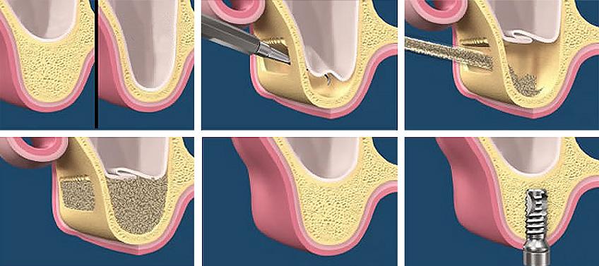 L’intervento può essere eseguito in base a due differenti approcci: laterale e crestale. Nel primo caso si cercherà di riempire il vuoto creando un foro sul lato della gengiva; nel secondo caso si cercherà di accedere dal basso, ovvero dalla zona dei molari.